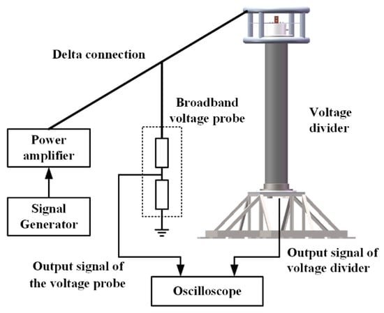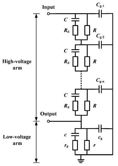 Precise measurement of transient voltage waveforms in power systems is of great significance to fault analysis, optimal insulation design, optimized high-voltage experiments, etc. At present, online monitoring of transient voltages can be achieved by a voltage transformer, bushing tap, optical electric field sensor, high-voltage divider, etc. [1,2,3,4,5]. Among them, voltage transformers are made of a non-linear ferromagnetic material and have a narrow bandwidth [6,7,8,9]. Optical electric field sensors have a good performance in terms of bandwidth, but their practical measurement accuracy is limited by their poor stability against temperature, vulnerability to vibration and inter-phase coupling [10]. The application of the bushing tap method interrupts the grounding connection of the tap, which introduces a safety risk [11]. Therefore, a broadband high-voltage divider is required, to a certain extent, in power systems for transient voltage monitoring.
