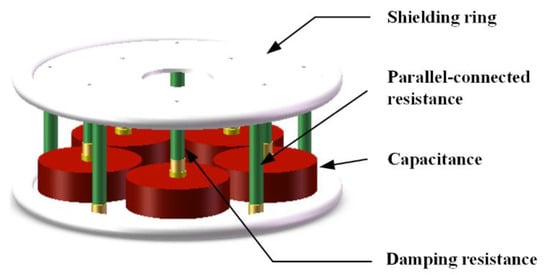 Conventional parallel-connected resistive–capacitive voltage dividers are mainly used for DC and power frequency measurements, of which the high-frequency performance is generally not sufficiently developed. A large physical size is generally required for the sake of the insulation strength consideration, which limits the high-frequency performance by introducing stray parameters (i.e., stray capacitance and lead inductance). In order to reduce the lead inductance, each unit in the high-voltage arm includes a parallel connection of five groups of capacitors and damping resistors. In order to improve the thermal capacity of the parallel resistances, each unit has five resistors in parallel, as shown in Figure 2. The height of each unit is only 80 mm.