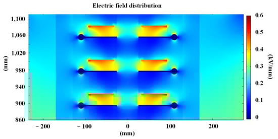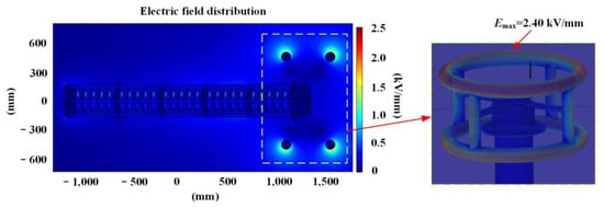 The electric field simulation adopted the Dirichlet boundary condition to solve the problem [26]. The excitation potential was applied on the metal flange at the top the voltage divider, and the metal flange at the bottom of the voltage divider was grounded. The simulation results are shown in Figure 3, Figure 4 and Figure 5 for when the applied voltage was 360 kV, which is the highest tolerated power frequency voltage. The high-field strength area outside the divider body is mainly distributed at the edge of the top shielding electrode, with the maximum value of 2.40 kV/mm. The highest field strength inside the divider appears at the connection point of the capacitor and resistor in the resistive–capacitive branch, which is 3.49 kV/mm. The breakdown field strength of the transformer oil is no less than 28 kV/mm, which is much higher than the calculated maximum local field strength; thus, internal discharge is not likely to occur under normal operating conditions.