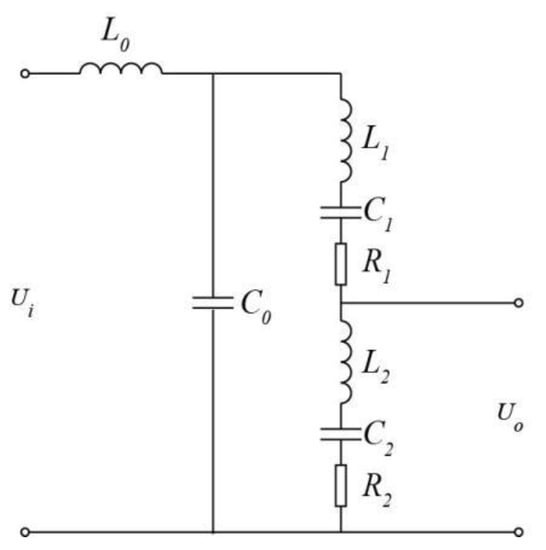 The frequency characteristic in the amplitude of the voltage divider via the frequency sweeping method is shown in Figure 8 for when L0C0 >> L1C1 and L2C2. The calculation shows that, when the measured frequency is close to the resonance point of L0C0, the output voltage increases by several times that of the flat section. With the further increase in frequency, reactance L0 gradually exceeds reactance C0, the voltage divided by the divider gradually decreases and the output voltage decreases. In this case, the upper cut-off frequency of the voltage divider is mainly determined by the L0C0 resonant frequency. The resonant frequency ω0 of L0C0 is