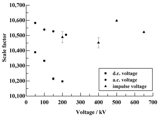 The scale factors under DC, the power frequency and the lightning impulse are shown in Table 2, Table 3 and Table 4. During the test, five groups of data at each test voltage were recorded, and the average values were computed. The scale factors under three types of voltages and different voltage levels are summarized in Figure 13. The test results show that when the scale factor of the voltage divider is calibrated to 10,500:1, the deviation is no more than 3% in measuring a DC voltage below 200 kV, a power frequency voltage below 220 kV and a lightning impulse below 700 kV. In the DC and power frequency voltage test, with the increase in the voltage, the temperature effects of the low-voltage arm components led to a certain decrease in the scale factor, but the change was so small that the overall linearity was still good.