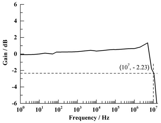 The output of the voltage divider is shown in Figure 14 for the wave response test. The output waveform is relatively flat, and the 10–90% rise time is about 29 ns. According to the mathematical relationship between the 10–90% rise time and the upper cut-off frequency [31,32]: