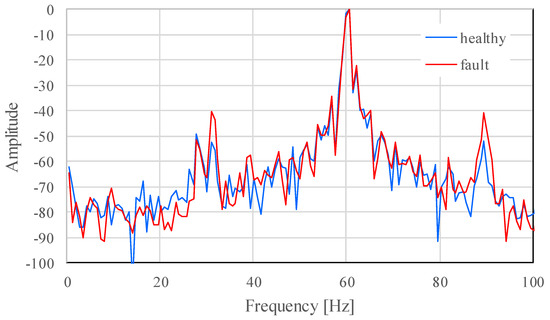 Fast Fourier transform was performed using waveforms of the U-phase current obtained. The frequency resolution is 0.76 Hz. An example of a frequency spectrum of faulty and healthy bearings at a rotating speed of 1750 min−1 is shown in Figure 3. The amplitude of the figure is normalized so that the maximum is set to 0 dB. The difference in amplitude is recognized around 30 and 90 Hz between spectra of faulty and healthy bearings. A similar difference is also observed in spectra obtained at other rotating speeds because when a mechanical fault occurs in a rotor, such as bearing damage, and the rotor becomes unbalanced, the rotor fluctuates in the rotating frequency and the load current is subjected to amplitude modulation by the rotating frequency . Therefore, the sidebands of are generated around the load current frequency [24].