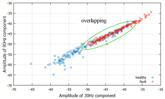 Figure 4 shows the feature distribution of healthy and faulty bearings, where the x- and y-axis represent the components of sidebands of the rotating frequency, respectively. From frequency spectra of the U-phase current, 140 data are obtained for each bearing condition (Figure 3). Depending on the bearing condition, features gather in a limited region. However, significant overlapping of two feature distributions occurs, which may affect the accuracy of diagnosis.