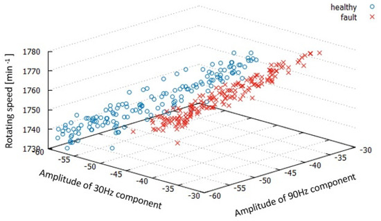 Figure 5 shows the rotating frequency dependence of the amplitude of the sidebands of around 30 and 90 Hz components. For each bearing condition, 160 data are shown. The amplitude of around 30 and 90 Hz components decreases almost linearly, decreasing the rotating speed regardless of the bearing condition. The data of faulty bearings are stored separately from the data from healthy bearings, with only a slight overlapping between them. Compared with Figure 4, the superiority of the three-dimensional display is obvious. The combination of three items (amplitude of the sidebands of the rotating frequency around 30 and 90 Hz components, and rotating speed) are promising for the bearing diagnosis when the rotating speed is changing constantly. Therefore, they are treated as fault diagnostics features in the improved diagnostics method. This is reasonable because the rotating speed may change at the site because of variations in load, fluctuation of voltage, and so on.