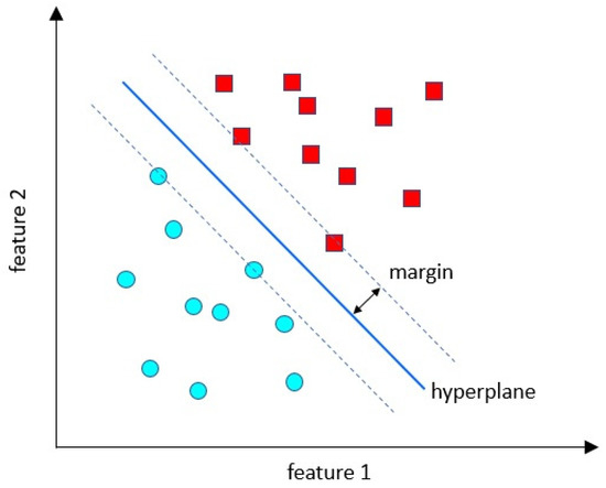 For example, data separated to two classes are distributed as shown in Figure 6. They are separated by the decision boundary. The purpose of the SVM algorithm is to find the decision boundary. The best boundary is called a hyperplane. The dimensions of the hyperplane depend on the features present in the dataset, which means that, if there are two features, then the hyperplane will be a straight line. Additionally, if there are three features, then the hyperplane will be a plane. The hyperplane is created so that it has a maximum margin, which means a maximum distance between the data points.