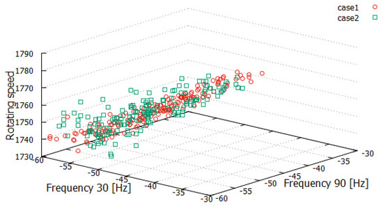 Data obtained in the experiment described in Section 2 were used to construct a diagnosis model. For healthy bearing (denoted as No. 1) or faulty bearing (No. 2), 100 data each were selected randomly. A datum consisted of three features: values of the sideband components around 30 and 90 Hz of load current spectrum, and rotating speed. The rotating speed ranged between 1780 and 1730 min−1.