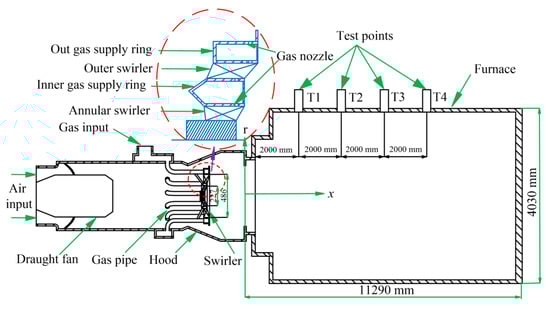 As shown in Figure 1, this experimental combustor is made up of four main components, namely the draught fan, fuel pipe, swirler, and furnace. The mainstream air is supplied by a draught fan, and a gas pipe linking to a gas pipeline delivers the fuel (natural gas). The furnace is an arched chamber with a transition cylinder on its inlet. Its length is 11,290 mm. The thermocouples are installed at four test points from T1 to T4 to measure the temperature in the furnace. Four 300 mm-long thermocouples are used to measure the temperature distribution inside the combustor (Platinum/rhodium alloy thermocouple, Type S Product Model Number: WRP-130). The measurement range is 273–1873 K and the measurement accuracy is ±6 K. A cartesian coordinate is established with its origin the center of the combustor exit. As shown in Figure 2a, the swirler includes annular and outer swirlers, and nozzles with different diameters are equally distributed around the inner and outer circumferences of the gas ring. The air flowing through the swirler forms a rotating jet, and the rest of the air forms a straight jet. Figure 2b is a co-rotating swirler used in the present experiments. Table 1 shows the specific structural parameters of a combustor.