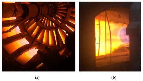 A comparison between the temperature measured by the experiment and the results obtained by numerical simulation is shown in Table 4. The numerical errors between them are less than 10%, and the simulation results have good reliability, so the values selected in this paper are verified. Thus, the values selected for this study can be used as simulation conditions to continue. Figure 3 shows the flame shape observed through the furnace observation window.