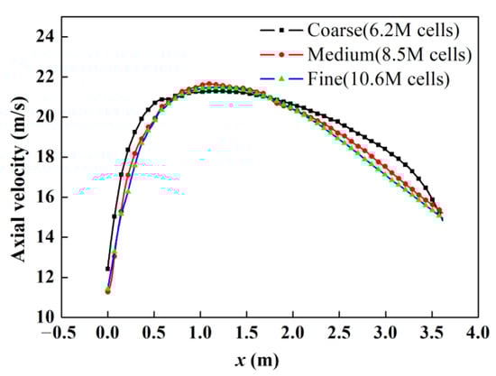 The quality of the grid has an influence on the accuracy of the calculation. Due to the irregular shape of the combustion chamber, unstructured tetrahedral grids are used. In this study, three different grid sizes are selected for independent study of the same burner model. The axial velocity on the central axis of the burner is chosen as an indicator to test the sensitivity of the results to the different grid sizes and the results are shown in Figure 4. The results for the coarse grid differ from the other two types. In contrast, the profiles of the medium and fine grids have similar trends and mainly overlap at each point. As a result, a medium grid number of 8.5 million is used for this study.