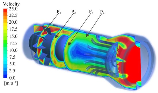 In this paper, the total air mass flow rate and total fuel are fixed, i.e., the load condition is the same. The influence of back pressure on airflow distribution behind the draft fan is obvious from Figure 5, which affects the air flow rate through the primary stage (the annular swirler). There are possible solutions to improve this phenomenon. The first option is to increase the distance between the draft fan and the swirler.