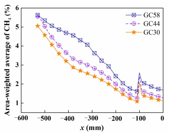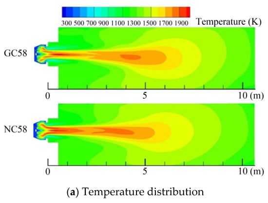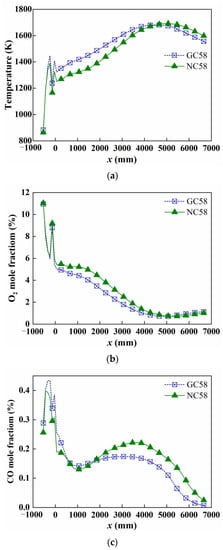 The air flow rate at each swirler is the same since the geometry does not change. The temperature gradually rises and reaches a peak, and is about 100 K higher than GC58 during x = 0 to x = 4.5 m as shown in Figure 14a. The reason for this is that more methane is ejected through the OCTOGSR (outer circumference of the outer gas supply ring) and the local equivalence ratio is improved. However, the temperature continues to rise for GC58 from x = 4.5 to x = 5.3 m, so it can be inferred that there is still a small amount of methane that is not completely burning, and the mixing effect is not satisfactory. Additionally, the flame length of NC58 is shorter than that of GC58, and more adaptable to industrial furnaces.