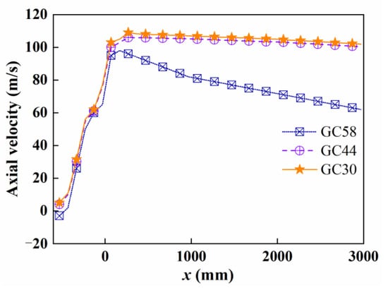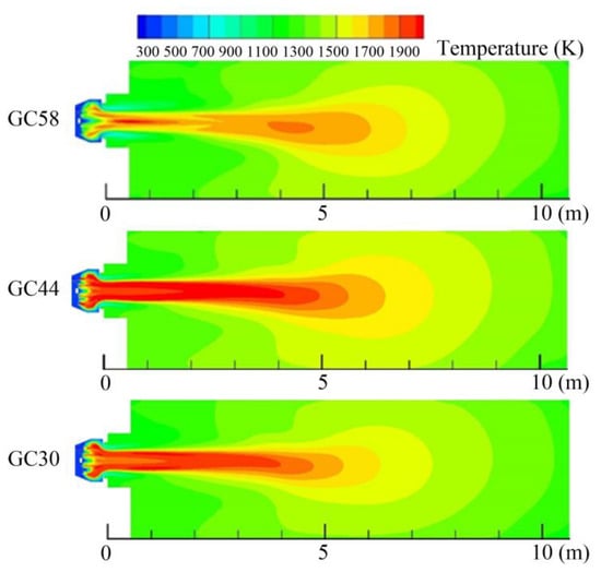 The tangential velocity is small for the GC44 and GC30, resulting in the mixing process of methane and air being longer, so the high temperature range of the two combustors is wider. However, there are obviously differences between them and GC58. As shown in Figure 8, the temperature of GC58 is the lowest in the entire region. The reason for this may be that the methane and air are uniformly mixed.