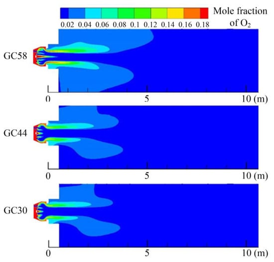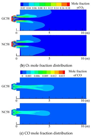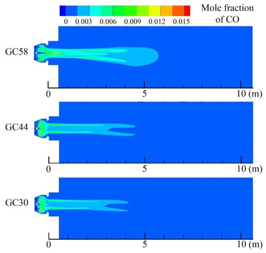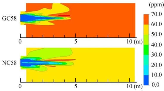 Compared to the O2 distribution shown in Figure 9, the range of oxygen concentration is the largest for GC58. The lowest air flow rate was obtained for air passing through the swirler for GC58, and this means that more oxygen is carried by the peripheral jet downstream. Compared to the CO distribution shown in Figure 10, CO is an intermediate product during the combustion of methane, and it is a reducing gas. This variable is important to reduce the amount of nitrogen oxides produced. The N2 in the air generates NO in a high temperature and oxygen-rich environment, but the NO is reduced under a reducing atmosphere of CO. During the combustion process using natural gas as fuel, the nitrogen oxides produced are mainly thermal NO.