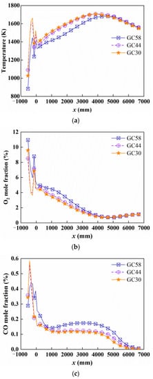 We can see that the temperature of GC58 is lower than the other two combustors shown in Figure 11a. Despite the air being more strongly mixed with methane, the amount of air flowing through the outer swirler is the smallest, so the amount of heat released is low in the case of insufficient air. However, the temperature profiles basically coincide with the other two combustors. The air flow rate through the outer swirler is essentially uniform for GC44 and GC30, so the trend of temperature is similar. The mole fraction of O2 has dropped sharply near the swirler shown in Figure 11b. This means that a large amount of heat is released near the swirler. This causes a dramatic increase in temperature, as shown in Figure 10. The mole fraction of O2 suddenly rises at a certain position. The reason for this is that this position is near the constricted section of the hood, which corresponds to the temperature profile. Besides, the O2 consumption rate of GC58 is significantly higher than others in the furnace, and this is consistent with the previous conclusion. The peaks of GC40 and GC30 are 50% higher than GC58, as shown in Figure 11c. Because the air flow rate through the outer swirler is greater than GC58, a large amount of CO is formed according to the chemical reaction mechanism.