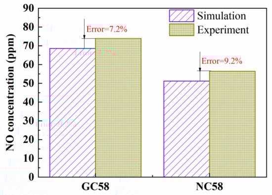 From the combination of Figure 15 and Figure 16, it can be concluded that increasing the equivalent ratio of the tertiary air region improves the mixing efficiency of gas and air, which reduces the NO at the furnace outlet. Thus, the combustion performance of NC58 is better than GC58.