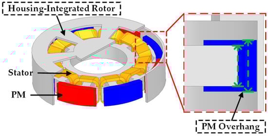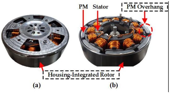 Three-dimensional structures, such as the magnet overhang and housing-integrated rotor, are used to increase the power density. When a housing-integrated rotor is applied, the magnetic flux path is secured, and the radial thickness of the yoke can be reduced. When a magnet overhang is applied, the air gap flux density can be increased [9,10].