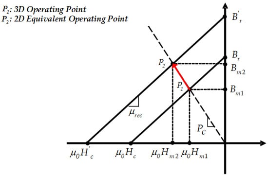 Equation (1) is about the magnetic energy of a PM as a function of magnetic flux density, magnetic field strength, and volume. In Equation (1), , , and are the magnetic flux density, magnetic field strength, and volume at the operating point of the PM in the existing model, respectively. , , and are the magnetic flux density, magnetic field strength, and volume at the operating point of the PM in the 2D corrected model, respectively. , , and are specified values in the 3D model, and when converted to 2D, decreases to become ; therefore, and should increase. To equalize the degree of energy flow when adjusting the operating point, the operating point , of the 3D model’s PM should be the operating point , of the , which is the permeance coefficient, in the load line, as shown in Figure 2 [13,14,27].