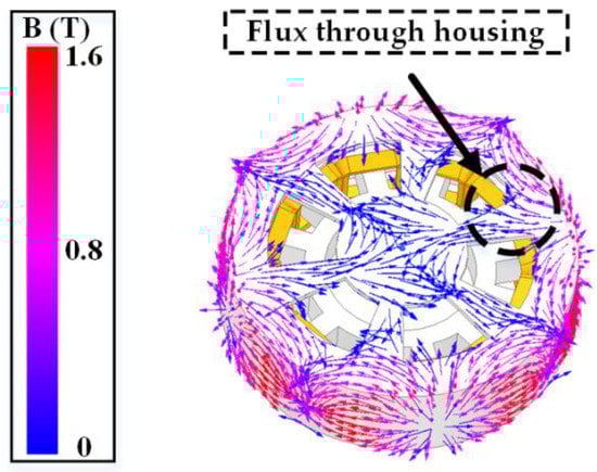The housing-integrated rotor is a 3D structure that is applied to secure the magnetic flux path and reduce the size of the device. As shown in Figure 3, when analyzing the 3D FEM, the magnetic flux flows not only in the yoke but also in the housing part. It is impossible to consider the housing part of the housing-integrated rotor in 2D when performing a 2D FEM analysis. When only the 3D yoke part is expressed in 2D, the rotor is significantly saturated.