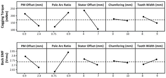 Before proceeding with the RSM by applying the presented factors, meaningful factors should be selected through factorial design. Applying the factorial design can select factors that significantly affect the objective function and shorten the unnecessary optimization time. In particular, in the multi-objective optimization method, the effect on each objective function can be analyzed and selected according to the purpose. In this study, the factorial design is used; the coefficient represents the number of levels and the exponent represents the number of factors. In the two-level factorial design, the level of all factors was two, and the relational expression between factors and response values can be expressed simply and efficiently. Figure 5 shows the relationship between the cogging torque and back EMF, which were the objective functions of this study, and the variables. As the goal of this study was to reduce the cogging torque while maintaining the back EMF, variables that had a small influence on the back EMF and had a large influence on the cogging torque were advantageous. As shown in Figure 5, the PM offset, stator offset, and tooth width were selected because the pole arc ratio has a significant influence on the back EMF, and chamfering has little effect on either objective function.
