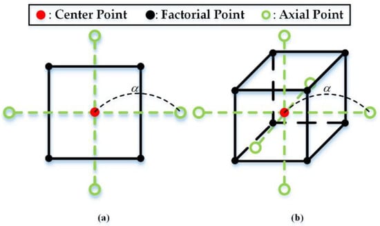 When evidence of curvature is found in the factorial design with the center point, the RSM is performed to determine the optimal point. In this study, the central composite design (CCD), which is generally used among RSMs, was applied. Figure 6a,b shows the CCD when two and three factors are applied, respectively. As shown in Figure 6, the CCD considers the response value at the center and axial points, unlike the factorial design. Because the response values of the central and axial points exist, the curvature at the response surface and the quadratic terms of the response function can be estimated.