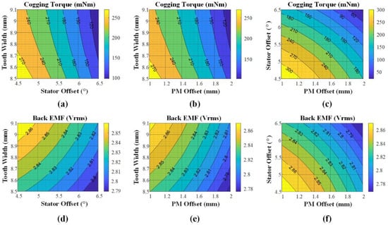Contour plot of the cogging torque with (a) tooth width and stator offset, (b) tooth chamfering and stator offset, (c) tooth chamfering and tooth width, and BEMF with (d) tooth width and stator offset, (e) tooth chamfering and stator offset, and (f) tooth width and stator offset.