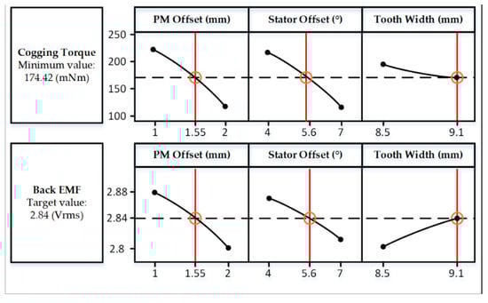Figure 7 shows the contour plot of the response value according to the changes in the factors. All the response surfaces have a curvature. As shown in Equations (9) and (10) and Figure 7, when the PM offset and stator offset increased, the cogging torque and back EMF decreased, and when the tooth width increased, the cogging torque decreased and the back EMF increased.