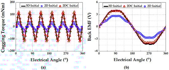 Figure 11a,b shows the cogging torque and back EMF results when the 3D structure was converted to 2D, respectively, and the results of the 3D initial and 2D initial models are also included; “2DC” in Figure 11 and Figure 12 means 2D corrected. The values of the cogging torque and back EMF in the 2D initial model were smaller than the values of the 3D initial model. This was because the volume of the magnet decreased and the energy decreased; the volume of the yoke decreased so that the magnetic flux path could not be secured. By deriving the operating point of the magnet according to Equations (1)–(5) and adjusting the B–H curve, the energy held by the PM was the same. In addition, the thickness was increased so that the yoke was not saturated. Figure 11 shows that the analysis results of the 2D corrected model were close to those of the 3D initial model.