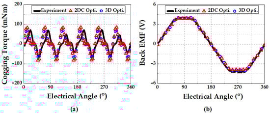 Figure 12a,b shows the cogging torque and back EMF of the 2D corrected model, respectively, when multi-objective optimization of the motor was performed by applying the RSM, and the results of the 3D optimization model and the manufactured model are shown. Figure 12a shows that the cogging torques of the experiment, optimized 3D model, and 2D corrected model were approximate. Figure 12b shows that the back EMFs of the experiment, optimized 3D model, and 2D corrected model are approximate.