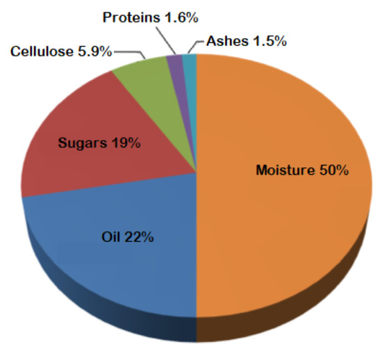 The composition of the olives depends on the cultivar, the meteorological conditions that characterized the different stages of flowering, as well as the growth and maturation of the fruit, the degree of ripeness at the time of harvest, the harvesting techniques, the duration and conditions of temporary storage, the cultivation practice, the location of the olive grove, the harvest time, the existence of any irrigation systems in traditional systems, and the fertilization. Figure 1 shows olive fruit’s average composition, including water, protein, oil, carbohydrate, cellulose, and inorganic substances. Table 1 [24,25] also gives the percentages of phenolic compounds and other essential compounds (pectin, organic acids, and pigments) in olive fruit.