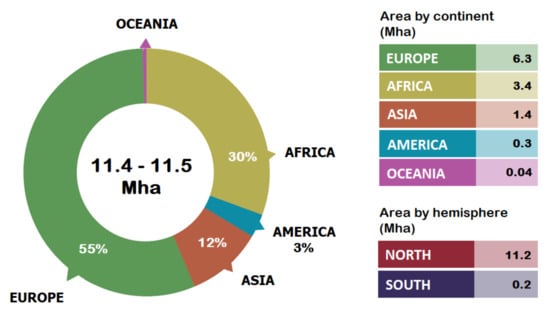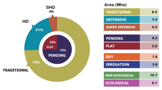 Traditional olive groves cover an area of 8–9 Mha worldwide, while modern ones cover just over 3 Mha [58]. Of these, 82% is covered by HD cultivation systems and the remainder, about 0.5 Mha, by SHD systems [59]. Faced with this situation, modern olive groves’ production per unit area is considerably higher.