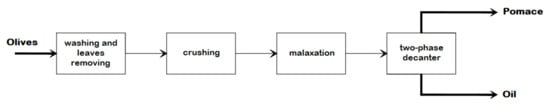 In order to produce high-quality oil, the olives must be harvested without breaking the skin, and the fruit should be processed within 12 to 24 h. Fruit should be separated by quality, with each grade processed separately [57,61]. Oil from olives is separated mechanically, unlike what happens for other fruits, seeds, and vegetables in general. First, however, it is necessary to carry out some of the upstream operations, in particular: