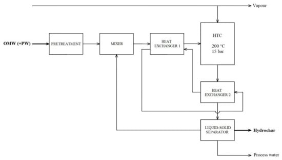 The application of HTC for the disposal and valorization of wet and very wet waste biomass from the agri-food industry, livestock farming, biological purification of urban wastewater, algae and other dedicated crops on non-marginal land has been the subject of research, technological development, modelling, and development of processes and plants at the pilot, pre-industrial and, in some cases, industrial scales by numerous researchers, public and private bodies and entrepreneurs. Recent scientific works made by the authors of this review are a testimony to this and, at the same time, a source of information [148,149,150,151,152,153]. On the other hand, this review reports the most recent works and reviews concerning the research activities on the application of HTC to olive oil production wastes and by-products regarding SOMW produced by the two-phase decanter and TCW and solid mixtures of these and other biomasses [154,155,156,157,158,159,160,161]. In Figure 8, a continuous HTC process with heat recovery for hydrochar (HC) production from wet and very wet waste biomass, including the two-phase decanter SOMW, TCW, and mixtures thereof, is schematically presented.