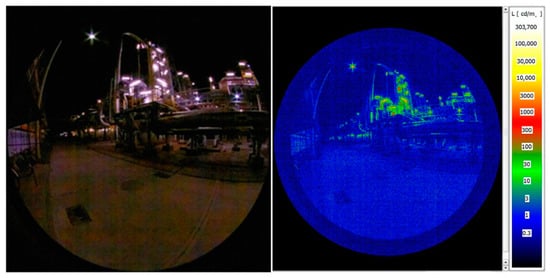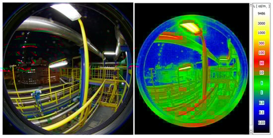 The view from the measurement point with corresponding luminance map. Measured GR = 62, subjective sensation of glare: disturbing, task of activity [5]: Handling of chemicals, inspection of leakage, changing of pumps, general servicing work, reading of instruments, GRMAX from standard [5] = 45. Similarly to Figure 5, in this case, the location of the glare sources determined the high level of glare (high GR value).