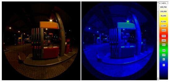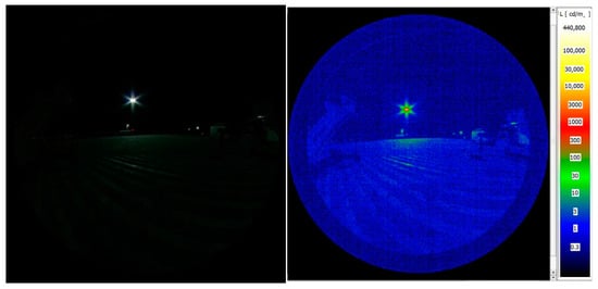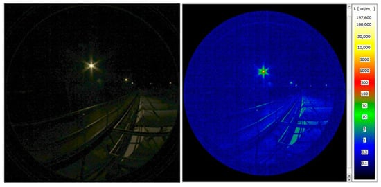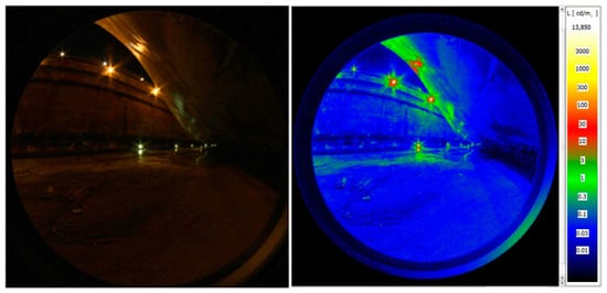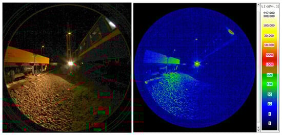 The view from the measurement point with corresponding luminance map. Measured GR = 79, subjective sensation of glare: unbearable, task of activity [5]: Freight track, continuous operations, GRMAX from standard [5] = 50. In this case, the location of the glare source determined the high level of glare (high GR value). The glare source is in the field of view very close to the line of sight. According to the formula of GR [40], the value of this index is inversely proportional to the square of the angle between the observer’s line of sight and the direction to the glare source.