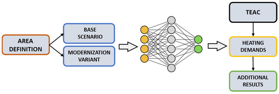 The TEAC software was developed using a procedure that has several steps. Some of them were performed just once (during the development process), some were repeated if necessary (gathering some additional data), and the others were repeated for each study (the actual usage of the TEAC software). The schema of the TEAC software application is shown in Figure 2. The ANN used in the software was trained with the results of 358,400 simulations, performed with the Energy Plus software for the Polish representative single-family houses (RSFH), in some selected locations and with various orientations, using the hourly calculation step. The total computing time lasted about 51 days. The defined database can be freely extended in the future if needed. The ANN application is presently a popular approach of UBEM [44,45]. The ANN in the TEAC software allows for heating demand predictions of buildings constituting the analyzed BEC. The trained ANN was validated in detail; the results are presented in our previous work—see Figures 4 and 5, as well as Table 1 in [35]. A satisfactory match was observed comparing the predictions with the Energy Plus outputs (the base results) by means of the correlation coefficient. Additionally, the validation proved that the TEAC software is able to predict a heating demand correctly, especially during meaningful moments (e.g., peak demands). The applied procedure, as well as the defined ANN itself, is comprehensively described in [8,35]. Using the TEAC software it is possible to define a residential area following the BEC concept. The software allows for various energy-, economic- and environmental-related analyses of the residential building cluster. Using the TEAC software we can analyze heating and electricity demands by means of load duration curves (LDC), various maps, economic assessments using different methods (e.g., life cycle costing, LCC), or environmental aspects expressed by the different GHG emissions.
