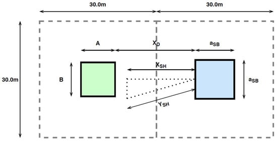 Both shading lengths (XSH and YSH) are shown in Figure 4 to illustrate an exemplary scenario. If XSH is greater than the distance between the building and an obstacle (XD), the solar outputs are equal to zero for the considered hour. The XD is easy to calculate because both the building and obstacle positioning on each parcel is known. The abovementioned analysis is performed for all obstacles in east, south or west from the analyzed building. The obstructions such as trees or natural hills are not included in the TEAC software.
