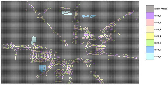 The Nowosolna cluster is a rectangle region, 2.70 km by 3.90 km (approximately 1053 ha of land), characterized by a low density of buildings. The area is defined using a grid of cells, while the image is slightly rotated (only by approximately 7 degrees counterclockwise) to fit the visible streets pattern. The examined zone consists of 11.7 hundred parcels. It can be seen that the building distribution is non-uniform and rather irregular; their placement was performed using an optical fitting. Additionally, it is taken into account that the center of this region consists of several public buildings (school, church, shops); thus, this part of the area was not considered. The schema of the examined BEC is presented in Figure 6; it consists of 1098 single-family houses, which is only 9.4% of all available cells.