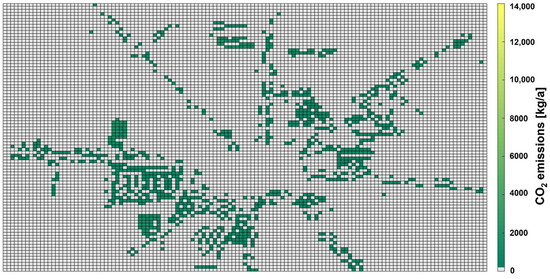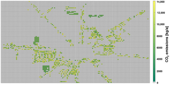 The results obtained out of the TEAC software can be presented by means of maps. The comparison of the CO2 emissions maps of the base (V0) and V3b scenarios is shown in Figure 7; the greener the cell the more environmentally friendly a building is. The total CO2 emissions could be reduced by up to 89.3%. Hence, a significant environmental improvement of the cluster is possible.