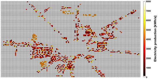The considered PVs are highly efficient ones, with the efficiency of 21% (280 Wp each); the total area of 25,028.85 m2 of PVs is assumed (the V2a variant). The considered system is examined as on-grid; thus, it is possible to transfer the surplus electricity generated to the grid. All of the PVs can produce up to 3606.20 MWh/a electricity, with a peak productivity of 4.19 MWp. The map of solar energy potential is shown in Figure 8; the examined neighborhood could be considered as a solar cluster whenever so many PVs are applied. The usage of wind energy is examined in two cases, for VAWT and HAWT, where results for the home applied turbines are assigned as V2b. The technical parameter of the examined turbines is considered following their technical documentation, 3.0 kW for the VAWT and 1.6 MW for the HAWT. Only two HAWTs are required to cover the peak demands; nevertheless, it covers the electricity demand of the cluster for approximately 37% of the time (3183 h). The usage of VAWT is not efficient; the application of singular turbines for each house provides a 14% reduction (saving of 1108.44 MWh) in the electricity demand of the cluster. A summary of the RES calculations is shown in Table 5. Due to the fact that the wind energy application is not so efficient for the Lodz localization, considering both the energy and economic aspects, only the V2a scenario is used in further analysis (as a basis for the V3a and V3b variants).