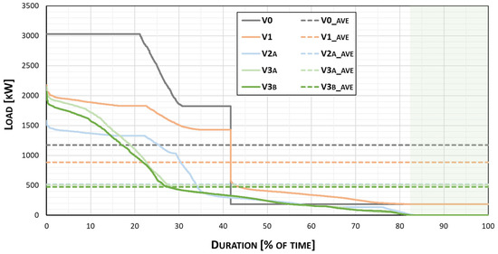 Finally, the results can be presented by means of LDCs; in Figure 9, the electricity LDCs for the analyzed scenarios are compared. It can be seen that for all of the modernization variants, the peak demands are lower and the overall load is more uniformly distributed in time. The application of PVs successfully shifts the demand, while both V3 scenarios allow us to use the full potential of the applied RES. The V3b scenario is the most profitable both in terms of the grid safety and its stability; it provides the zeroth demand (marked as a green box in Figure 9) for approximately 18% of the year.