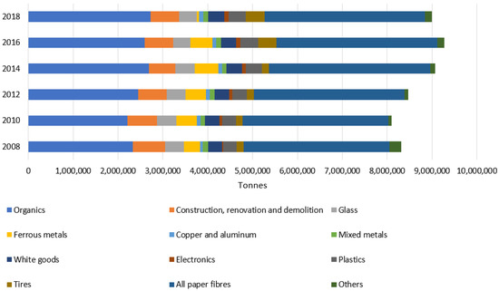 Figure 1. Materials prepared for recycling by companies and local waste management organizations in Canada. The authors originally produced the figure from Canada’s national statistical agency [9].