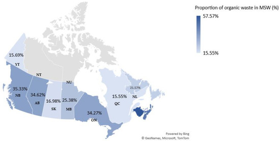 Figure 2. The proportion of organic waste diverted from municipal waste in Canada by province. The authors originally produced the figure from Canada’s national statistical agency [9].