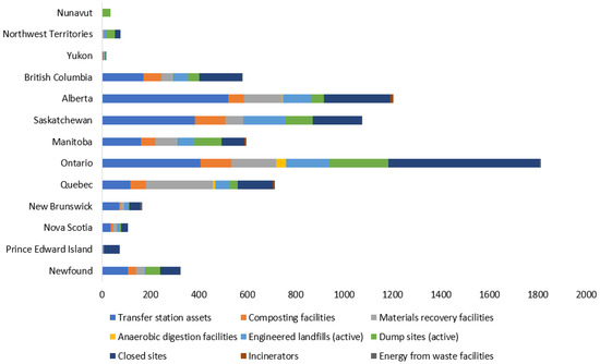Figure 3. Public-owned MSW management infrastructures in Canada. The authors originally produced the figure from Canada’s national statistical agency [28].