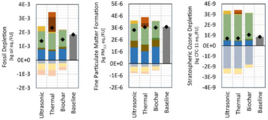 Figure 4. Comparison of ultrasonic, thermal, and biochar LCIA results with the baseline scenario at an industrial scale. Copyright 2021 by Elsevier [11].