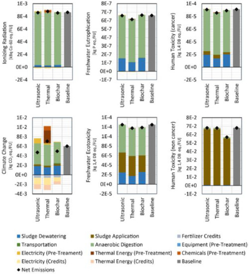 In the above paragraphs, mechanical, thermal, biological, and physical pretreatment methods were comprehensively introduced and discussed. However, it is worth mentioning that there are only a few references worldwide applying such pretreatment methods. This is mostly due to technical, energy, economic and environmental barriers. Mainardis et al. have recently could develop a reliable and standard protocol based on physicochemical characterization, experimental tests, LCA, and economic analysis to determine the up-scale feasibility of the proposed pretreatment method for AD of sewage sludge. They investigated six different pretreatment technologies: thermal, alkali, combined alkali–thermal, ultrasonication, icing–thawing, and biochar addition. Among the proposed methods, in terms of biomethane potential, low-temperature thermal pretreatment (110%), ultrasonication (53%), and biochar addition (16%) showed the best performance. Figure 4 compares the LCIA results of ultrasonic, thermal, and biochar scenarios with the baseline scenario. In most environmental criteria, proposed pretreatment methods showed better performance. However, the economic analysis showed that the capital costs of these methods could not be recovered in 15 years only if we consider heat recovery for thermal pretreatment and lower price for the biochar addition scenario [11]. We believe that the current protocol is a robust tool to assess a proposed pretreatment technology from the technical, energy, economic and environmental points of view within the Canadian context.