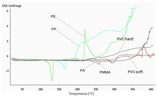 Figure 1. Differential scanning calorimeter (DSC) analysis of pure polymers used in the case study: polyvinyl chloride (PVC), including hard PVC (uPVC) and soft PVC (PVC-P); polyethylene (PE); polypropylene (PP); polyamide (PA); and poly(methyl methacrylate) (PMMA).