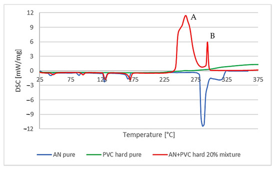 Figure 2. DSC analysis of pure ammonium nitrate (AN), pure hard PVC (uPVC), and their mixture (20%), heat rate 10 °C/min. Enthalpy of the mixture decomposition process ΔHA = −1384 J/g, ΔHB = −66 J/g (values of A and B reactions are given in Table 1).