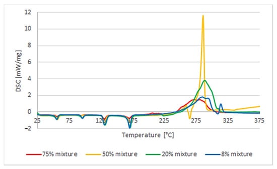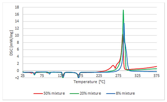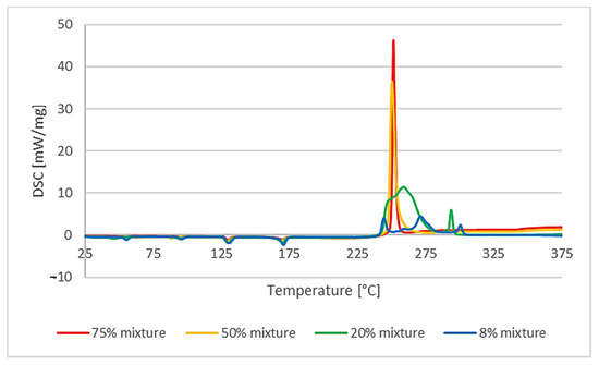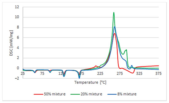 As in the case of uPVC, reducing the amount of material to 8% by mass reduced both the reaction initiation temperature (248.1 °C) and the reduction of its heat effect (−1265 J/g). Moreover, similarly to the previous case, a splitting of the decomposition reaction was observed. In contrast to uPVC, increasing the amount of polymer in the mixture to 50% also resulted in a reduction of the heat effect to an even greater extent than in the case of the 8% mixture (−813.2 J/g). In addition, a significant reduction in the reaction initiation temperature was observed, which, in this case, was 244 °C (Table 2).