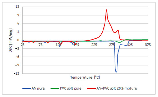 Figure 4. DSC analysis of pure AN, pure soft PVC (PVC-P), and their mixture (20%), heat rate 10 °C/min.